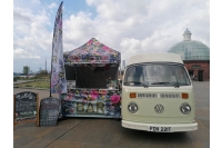 Bonnie & Rose Bar’s 2m x 2m branded gazebo looks beautiful printed with their bespoke floral pattern. Here’s what they had to say: “Can i just say I LOVE MY GAZEBO it really is so special.” The outside of the 2m walls were printed with pastel stripes to complement the striped canopy of their VW van and a stock grey lining was added to the inside walls. Our half walls are the perfect height for serving and we were also able to produce a custom banner that can be attached to the velcro on the base of the canopy when required.