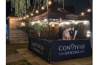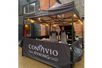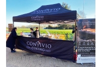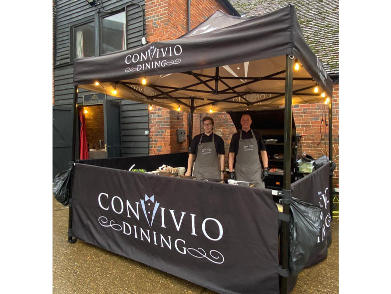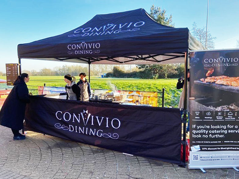Convivio Dining came to us in 2021 for a 3m x 3m custom printed gazebo package for their outdoor catering events. They have recently returned to purchase a 3m x 4.5m gazebo for their business, providing extra possibilities for serving space as well as branding space! Both awnings are customised versions of our Sport Package, with additional front half walls to create an enclosed working space that is accessible to customers. The black anodised Hex50 frame compliments their smart branding perfectly!