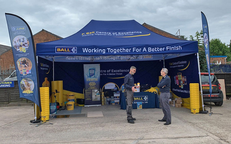F Ball chose our 4m x 6m Exhibition Package to take to events and demonstrate their latest products. Here it is in action over the summer. They have maximised the available branding space by upgrading to double sided print on the walls. Customers are able to print different artwork on either side of our walls so a great variety of branding, images and information can be presented throughout the structure. The 3.5m feather flags are a great attention grabber to complete the event space.
