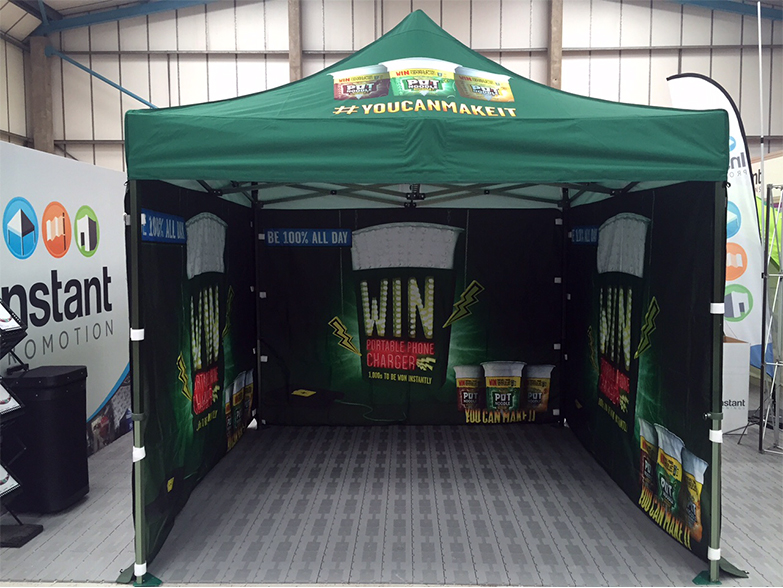 World famous Pot Noodle recerntly approached Instant Promotion to produce a number of 3m x 3m Instant Awnings with full colour dye sublimation printing. Pot Noodle specified the green Pantone colour and we matched it to perfection using the very latest sublimation printing technology.