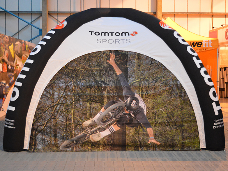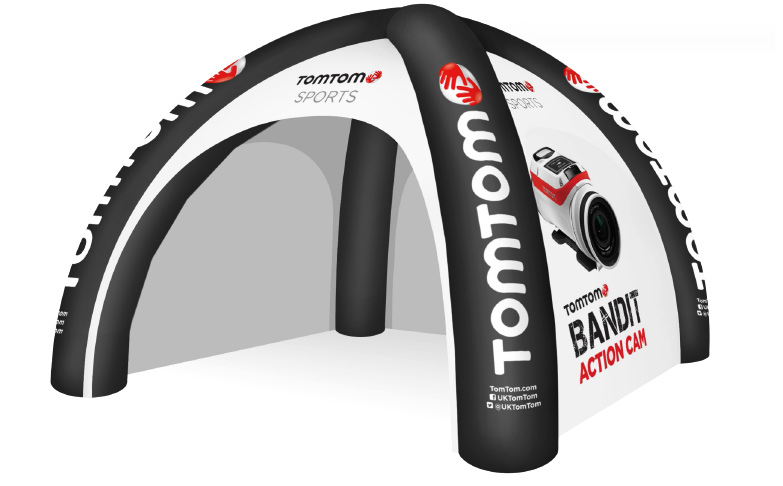 We arranged a meeting late November with TomTom’s Sports Marketing Team. They were very keen to get their new sports campaign up and running at various outdoor events around the UK, and they thought our Spider Domes would be a perfect fit. TomTom were hugely impressed with our range of attention grabbing full colour domes, and they saw particular value in the interchangeable door panels. By keeping a simple, generic TomTom design on the main this gave them maximum flexibility to promote a wider range of products by interchanging the zip in wall panels.