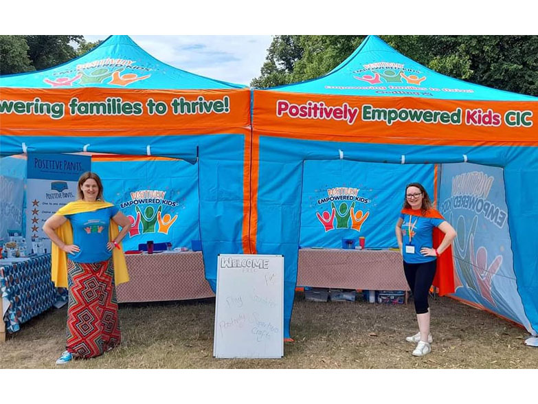 This set up from Positively Empowered Kids is a great example of how two of our 3m x 3m gazebos can be connected together to create a large 3m x 6m internal space. Adding the door walls to the front of stall creates a welcoming feel and and their colourful branding really pops with our vibrant dye sublimation printed materials.