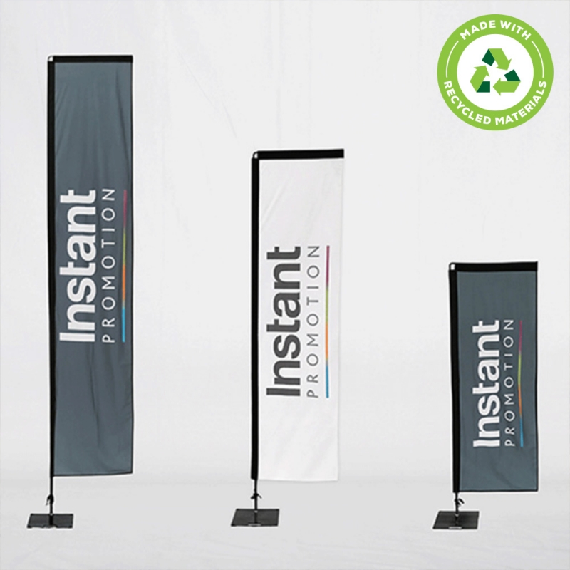 Demonstrate your brand's commitment to quality and sustainability. Our flags are produced from a premium 300D polyester mesh fabric that is made from recycled rPET material. This durable, double-stitched material is engineered to withstand outdoor conditions, providing a long-lasting and eco-friendly advertising solution.