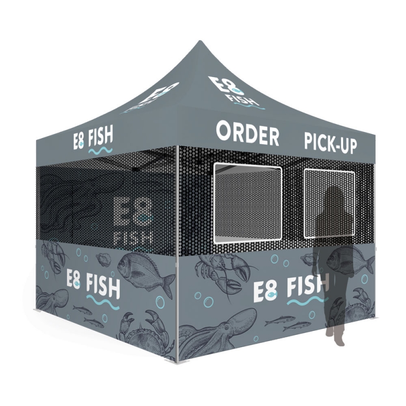 Every wall is printed in vibrant full-colour sublimation with Pantone colour matching and crafted from durable, waterproof, fire-certified 600D polyester. This smart setup streamlines customer interaction, improves airflow, and delivers bold, professional branding built for busy food service environments.