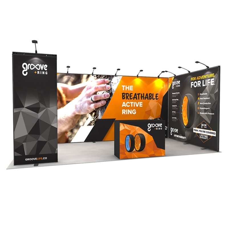 A 6m x 3m exhibition package with a bridge to add that extra dimension. Seamless stretch fabric graphics applied to the front of the 6m and 3m walls and double-sided graphics on the 1m bridging unit, make it great for space only stands. Optional LED lighting attached to the top of the frames illuminates the graphics and makes you stand out from the crowd! Add an optional counter with a seamless graphic wrap as a focal point to interact with customers.